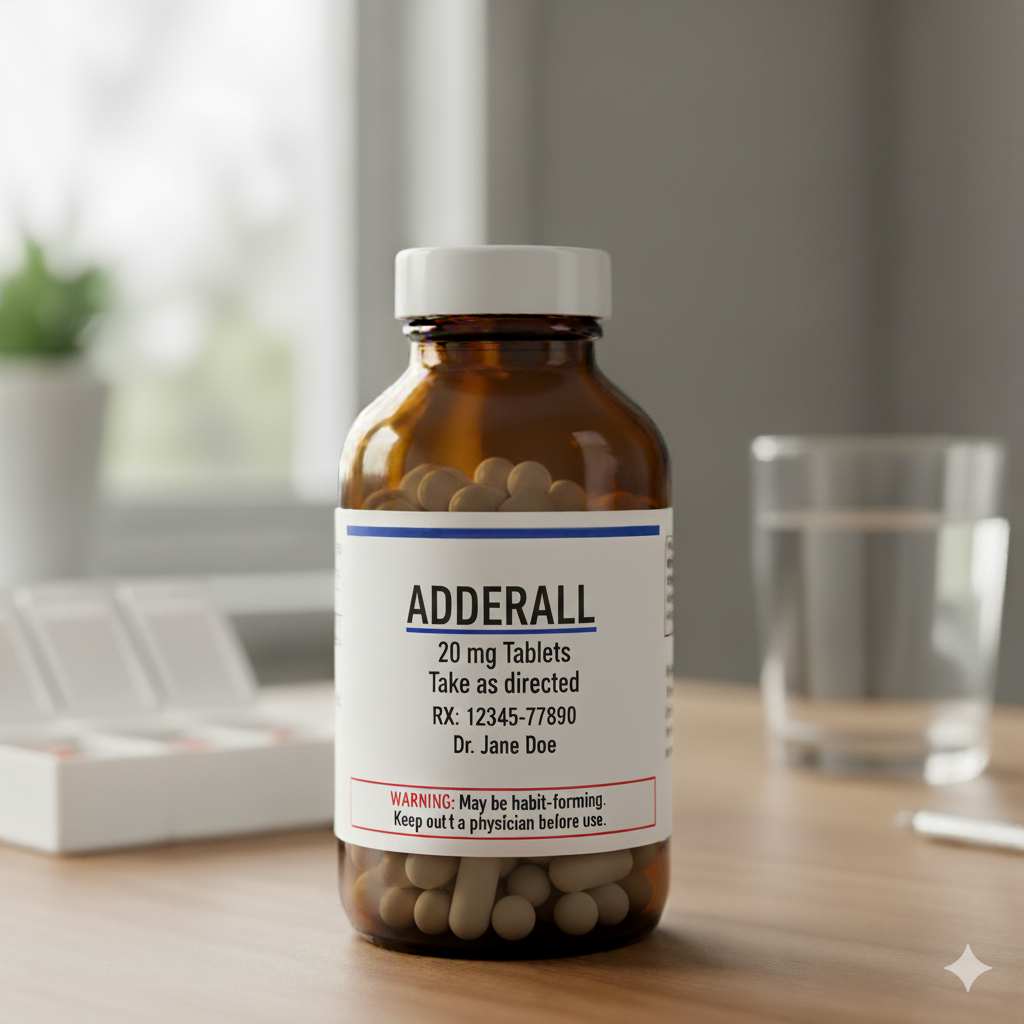 Adderall is a prescription stimulant medication containing amphetamine and dextroamphetamine. It is primarily used to treat ADHD (Attention-Deficit/Hyperactivity Disorder) and sometimes narcolepsy.